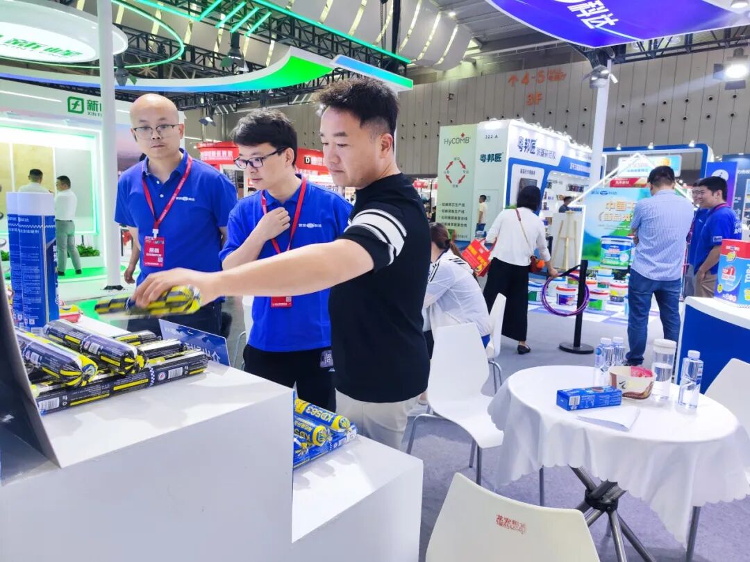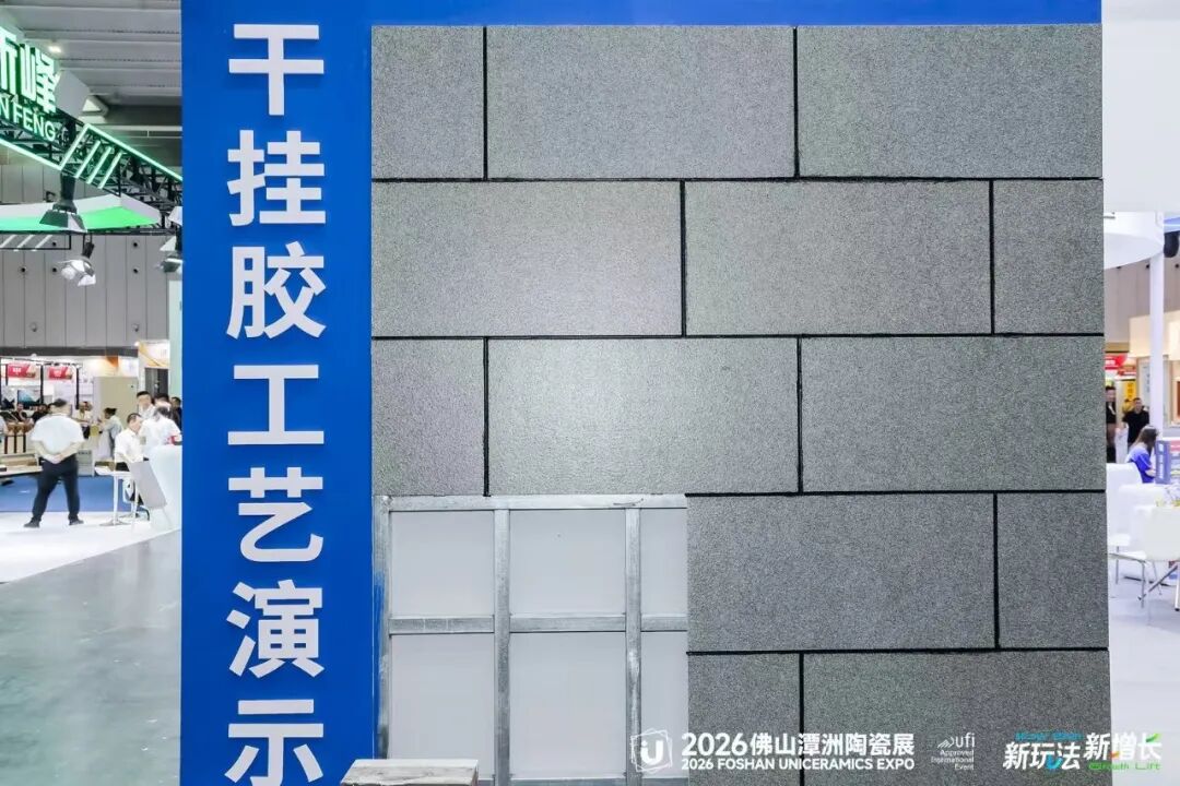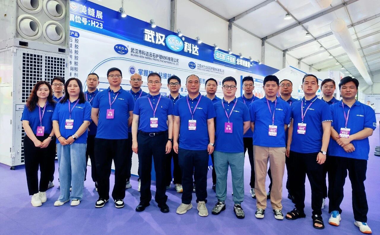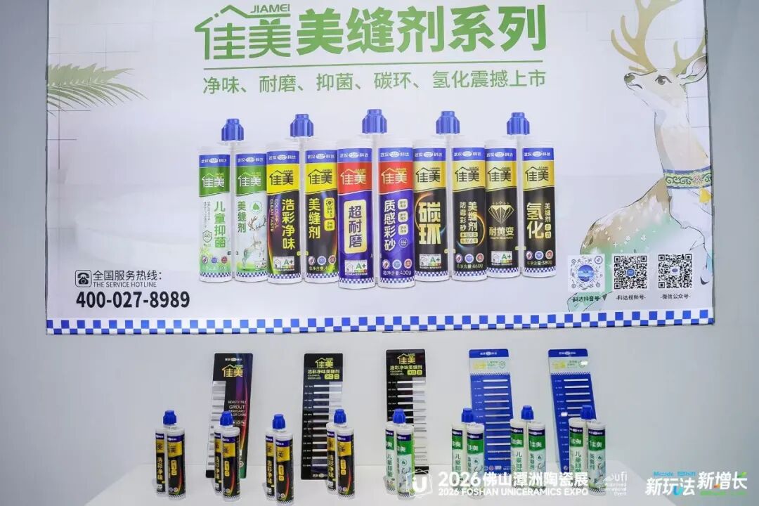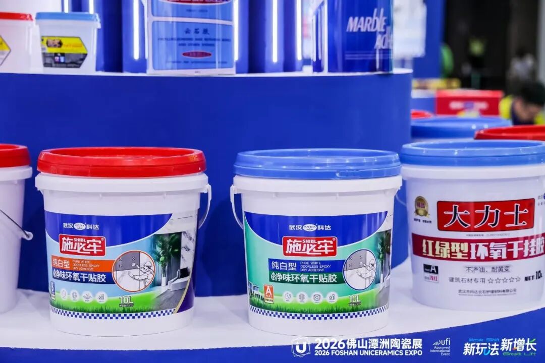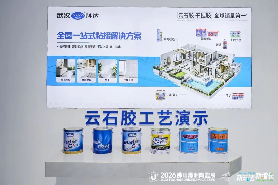 展位现场,科达集中展示了云石胶、干挂胶、干贴胶、瓷砖胶、背胶、防水、硅酮胶、美缝剂等全系产品,并配合工艺演示墙,直观呈现从基层处理到面层美缝的完整工艺层次。