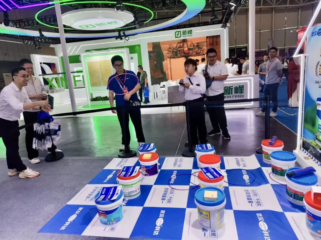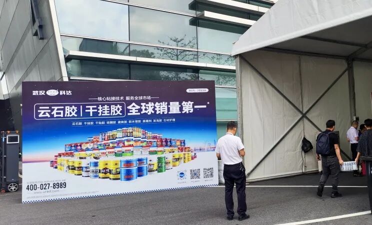 步入潭洲展场馆,“云石胶·干挂胶,全球销量第一”的主视觉格外醒目。同时,雷神/迅雷瓷砖胶、施必牢干贴胶的产品视觉也遍布展馆。