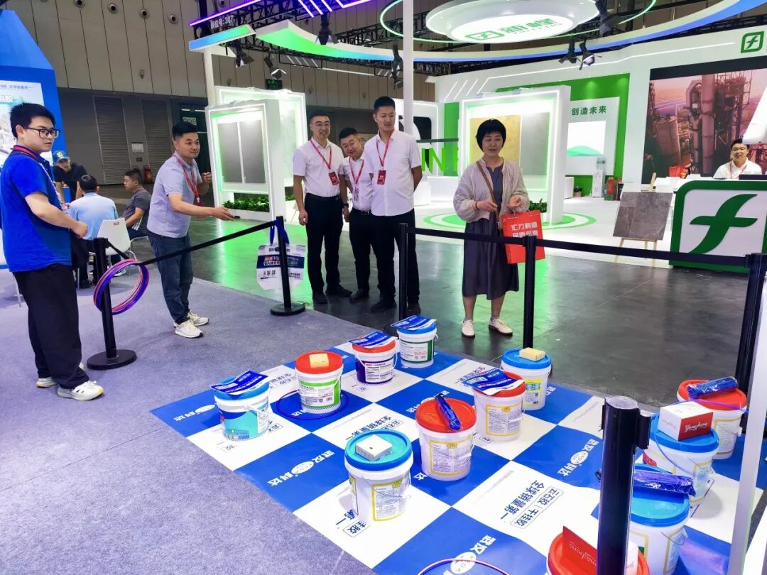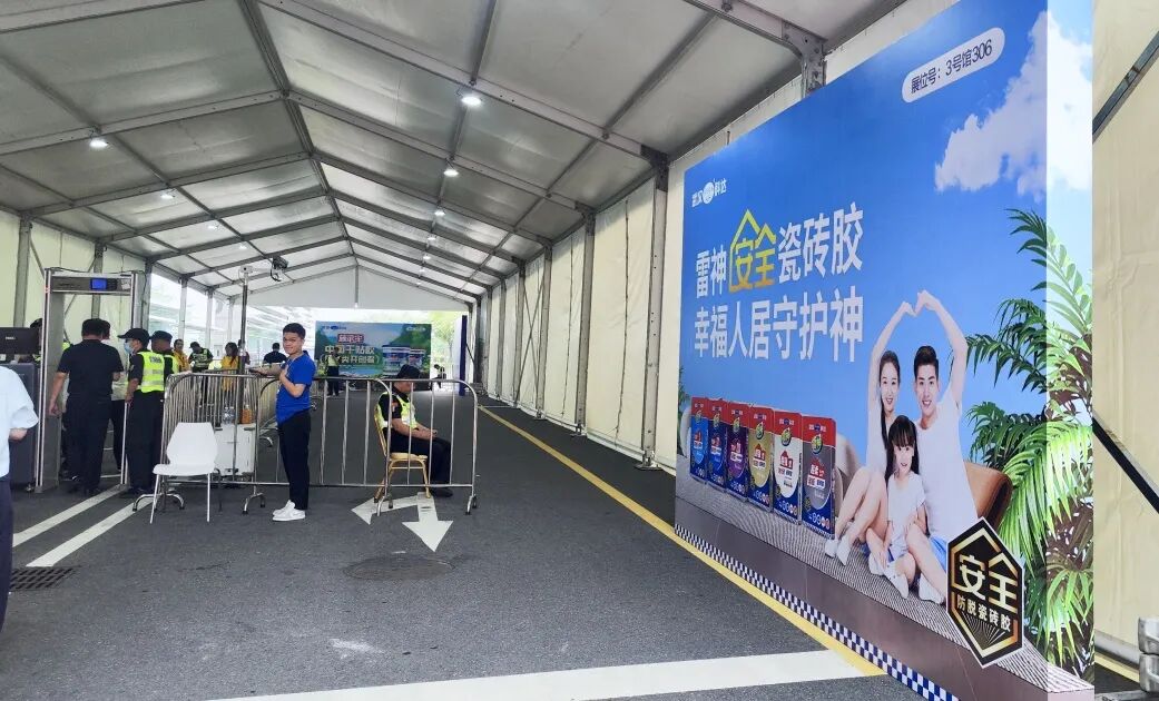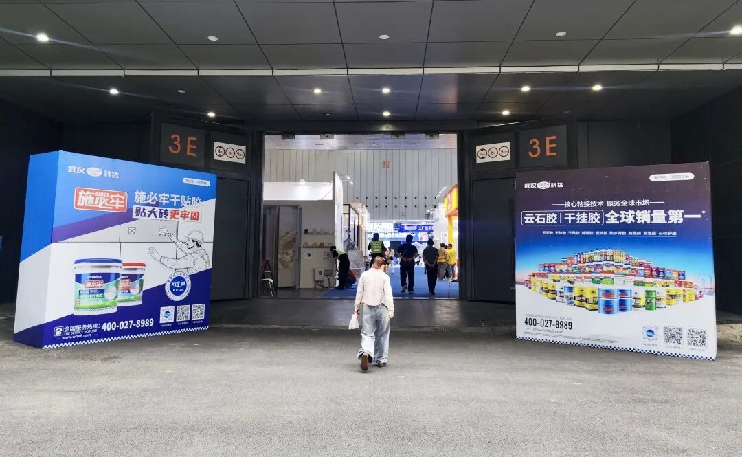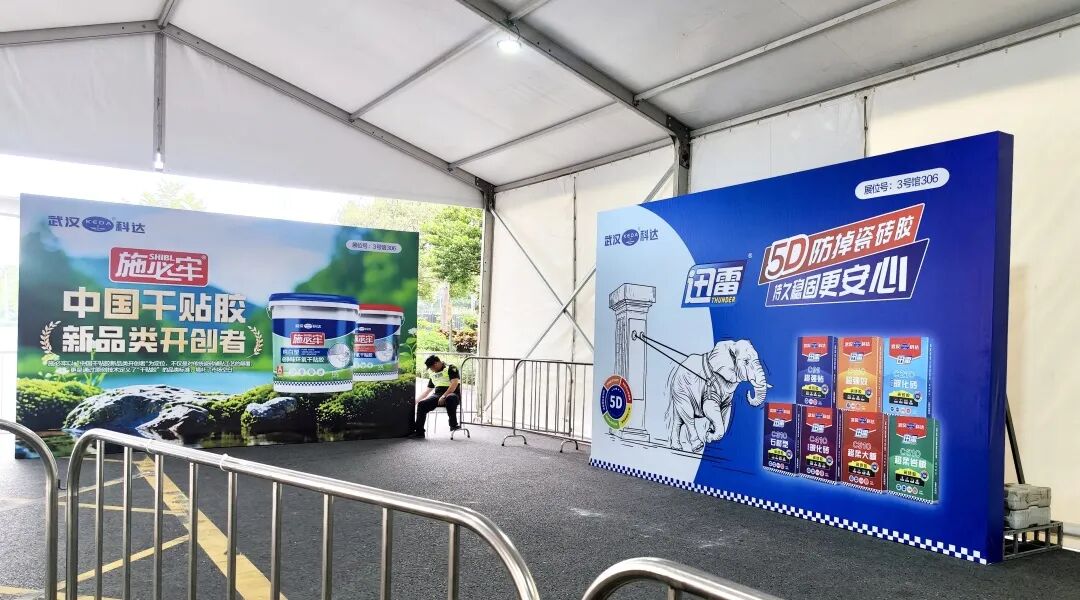 步入潭洲展场馆,“云石胶·干挂胶,全球销量第一”的主视觉格外醒目。同时,雷神/迅雷瓷砖胶、施必牢干贴胶的产品视觉也遍布展馆。