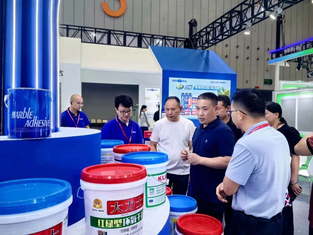 展位现场,科达集中展示了云石胶、干挂胶、干贴胶、瓷砖胶、背胶、防水、硅酮胶、美缝剂等全系产品,并配合工艺演示墙,直观呈现从基层处理到面层美缝的完整工艺层次。